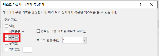 csv 확장자 자체는 'comma-separated variables'를 의미 하므로 텍스트 마법사 2단계에서 구분 기호로 쉼표를 체크한다.