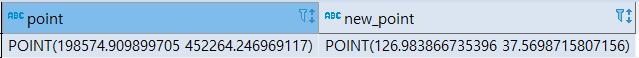 point가 2097 좌표계의 geometry 데이터이고 뒤의 new_point가 4326 좌표계로 변환한 데이터이다.
