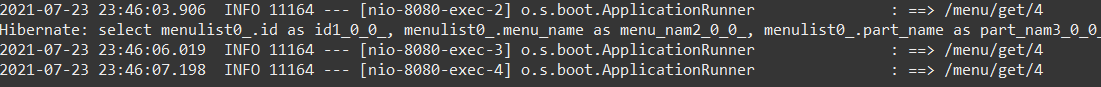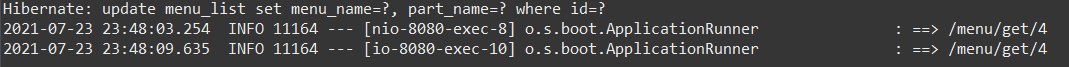 우선 getOneMenu(int id)로 프라이드 치킨인 4번 메뉴를 가져오면 위의 @Cacheable 설정 설명처럼 처음에만 DB에서 데이터를 가져오지 그 다음에는 DB에 가지 않는다.