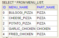 단순하게 메뉴 이름과 해당 메뉴가 치킨인지 피자인지 저장하는 테이블로 미리 값을 다 넣어놨다.