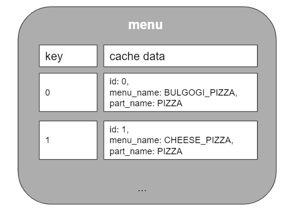 getOneMenu(int id)에서는 key를 '#id'라고 지정을 해놨는데 이럴 경우 getOneMenu(int id)에서 받는 파라미터 id 값대로 캐시 데이터가 저장되어 추후 각 캐시 데이터를 key 값에 따라 부분 업데이트를 할 수 있다. 즉, 아래와 같이 menu안에 key value와 같이 캐시 데이터가 저장되는 것이다. 만일 키를 따로 설정을 안 하면 해당 메소드의 파라미터로 들어오는 값들로 키가 설정된다.