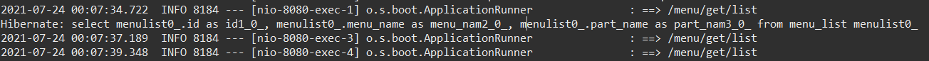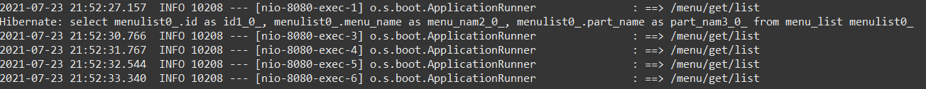 위와 같이 캐싱 기능을 사용하겠다고 설정을 하고 다시 getMenu를 여러 번 호출하면 아래와 같이 select는 처음 한 번만 이뤄지고 그 후에는 select가 이뤄지지 않는 것을 확인할 수 있다.
