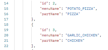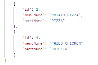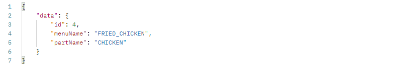 예를 들어 아래와 같이 'FRIED_CHICKEN'의 part_name을 'PIZZA'로 바꾸고 getOneMenu(int id)로 4번 메뉴를 가져오면 아래와 같이 'PIZZA'로 변경하기 전에 캐시되어 있는 데이터가 있으면 캐시되어 있는 데이터대로 'CHICKEN' 값을 갖고 있는 것을 확인할 수 있다.