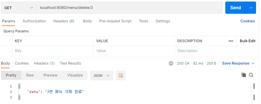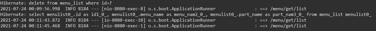 deleteOneMenu(int id)로 3번 메뉴를 삭제하고 나서 다시 리스트를 조회 해보면